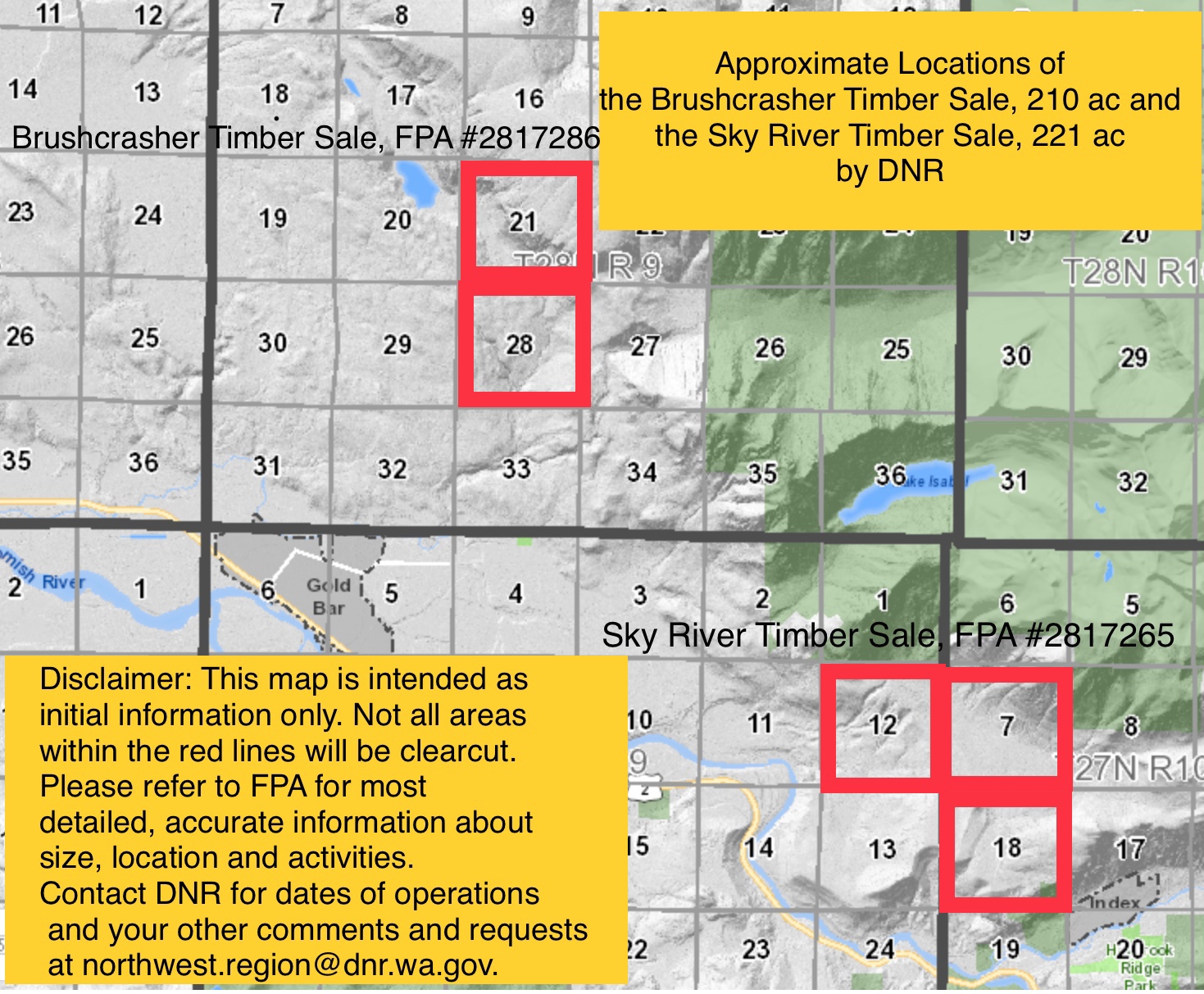 Next two large clearcuts are coming soon to the Reiter Foothills. Brushcrasher Timber Sale and Sky River Timber Sale by DNR (Department of Natural Resources) are 210 acres and 221 acres with a total of 22,841 feet of road construction for both.