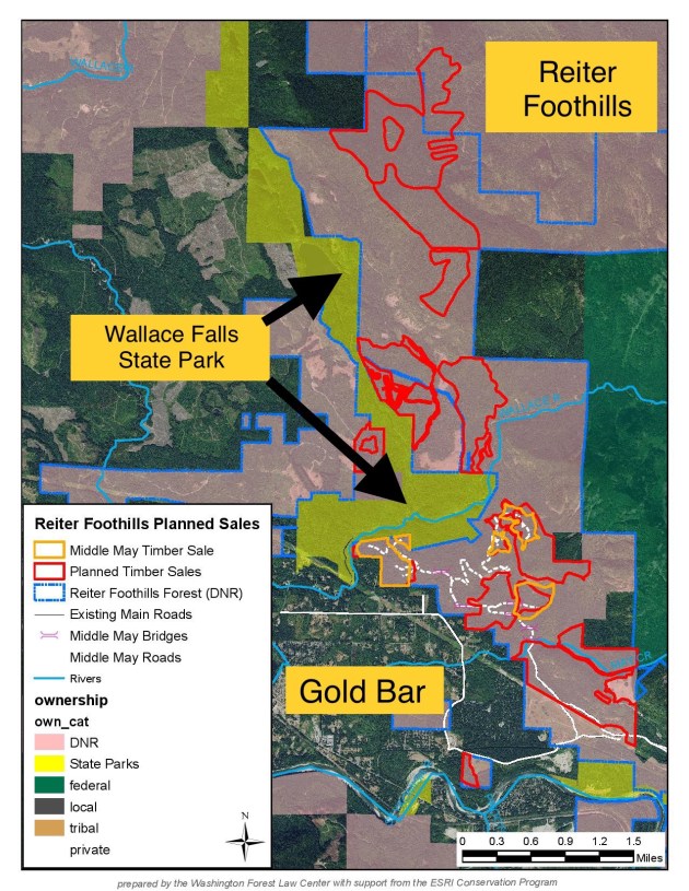 Reiter Foothills is 10,000 acres of Snohomish County land, tree plantations and sprayed clearcuts that are managed by DNR (WA State Department of Natural Resources). Reiter is adjacent to the rural community of Gold Bar as well as to the Wallace Falls State Park, one of the busiest parks in WA State with over annual 225,000 visitors.